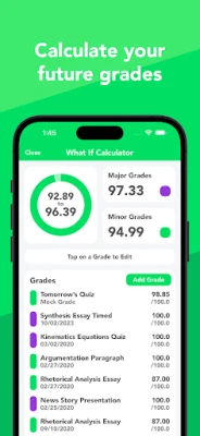 Predict your average by adding mock grades and changing scores to see how it affects your average. This will help you better set goals for the scores you need in the future.